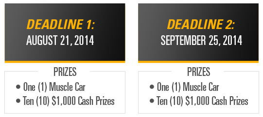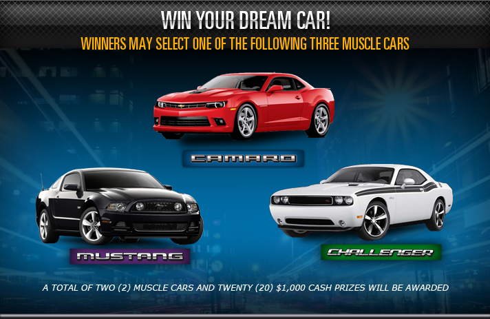 The Muscle Car Prize winner for each drawing will have the option to choose any one (1) of the three cars offered through this promotion. Each Muscle Car Prize includes dealers’ fees, dealer preparation, set up fees, freight charges, delivery charges, sales tax, registration and $15,000 Federal income tax withholding. Costs shall not exceed $60,000 per Muscle Car Prize. In the event that the cost of the Muscle Car Prize is less than $60,000, the difference between the actual cost of the Muscle Car Prize and $60,000 will be returned to the winner. In the event that the Muscle Car Prize winner prefers to forego the Muscle Car Prize for a cash prize, a cash equivalent of $60,000 (less applicable Federal income tax withholding) will be awarded to the Muscle Car Prize Winner.